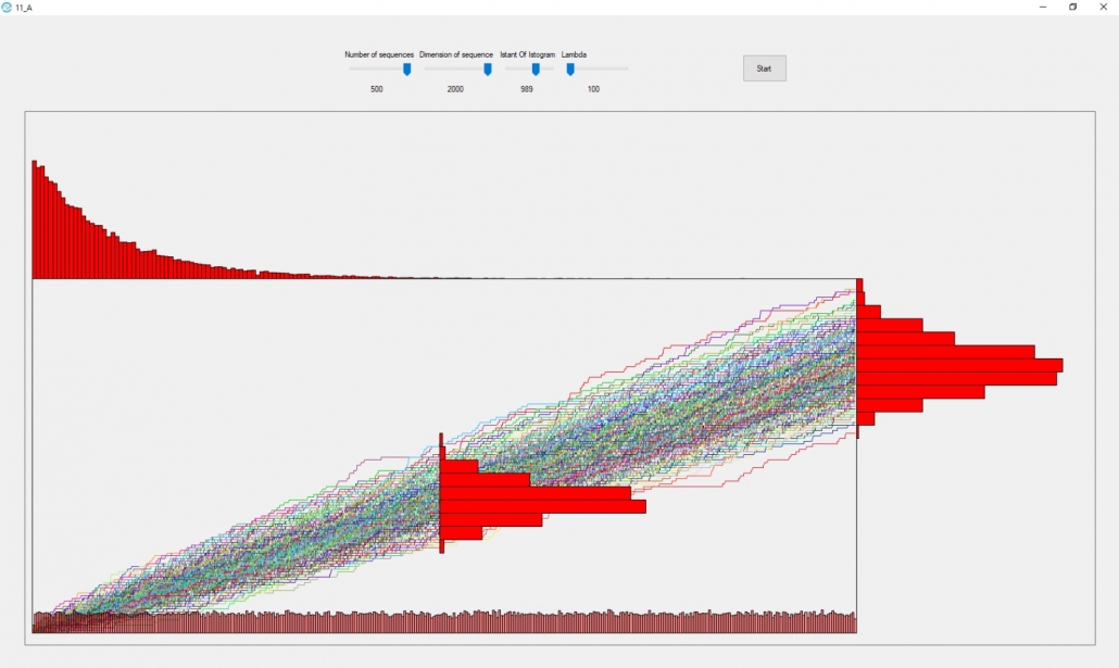 Same scheme as previous program (random walk), except changing the way to compute the values of the paths at each time. Starting from value 0 at time 0, for each of m paths, at each new time compute N(i) = N(i-1) + Random step(i), for i = 1, …, n, where Random step(i) is now a Bernoulli random variable with success probability equal to λ * (1/n) (where λ is a user parameter, eg. 50, 100, …).