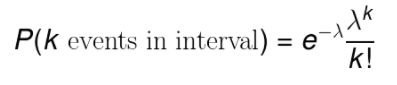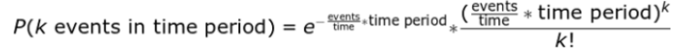 The probability function of the Poisson distribution gives the probability of observing k events over a period of time given the length of the period and the time-averaged events: