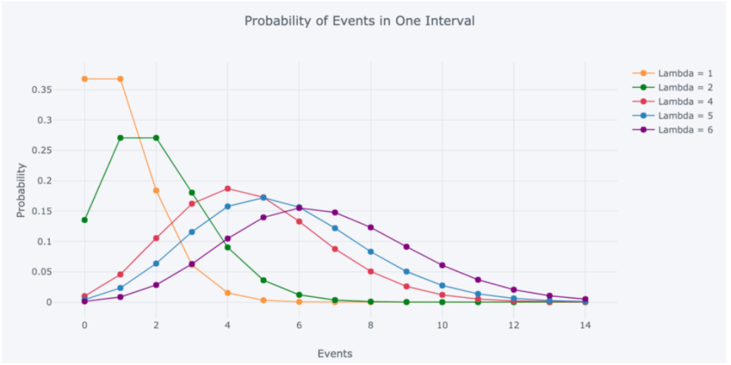 When we change the parameter λ we change the probability of seeing different numbers of events in an interval. The graph below is the probability mass function of the Poisson distribution which shows the probability of a number of events occurring in an interval with different velocity parameters.