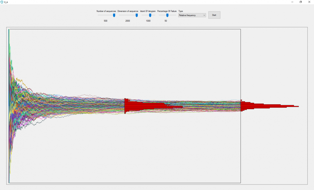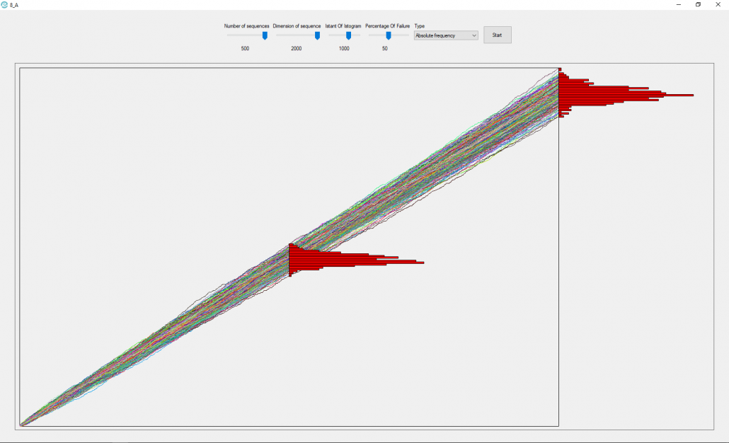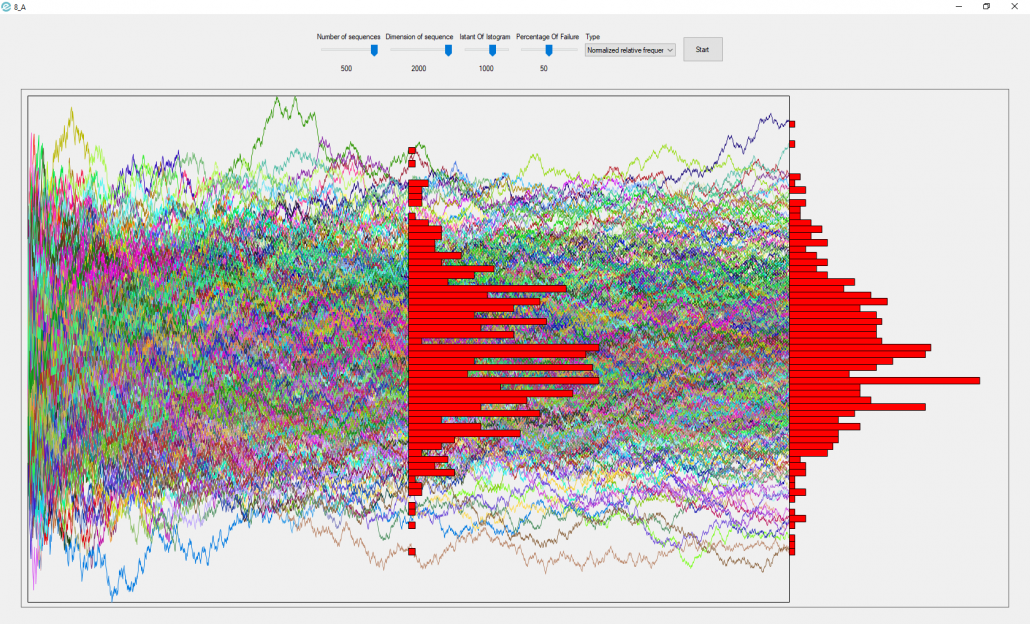 Once these parameters have been set, you can choose the type of data to be shown in the histograms. Pressing the “Start” button will generate m sequences made up of n points and shown in the pictureBox.